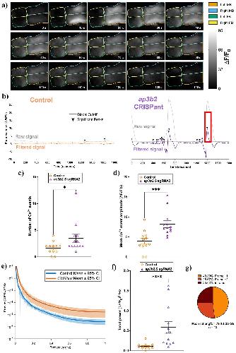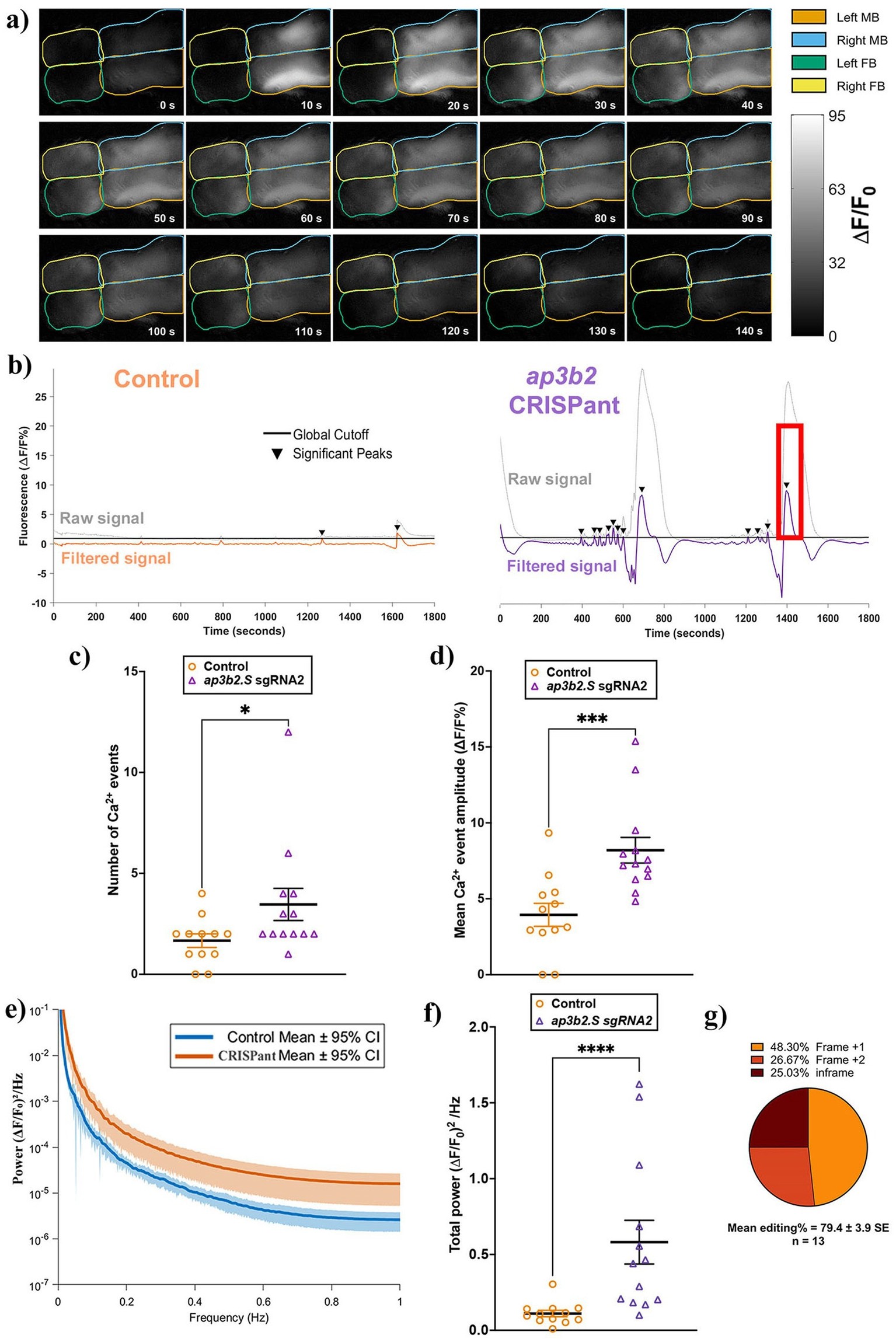 ap3b2 CRISPant brains have elevated spontaneous Ca2+ activity compared to unedited controls in CRISPants. (a) Representative still frames acquired every 10 s from ap3b2 CRISPant tadpole brain during in vivo widefield Ca2+ imaging. GCaMP6s fluorescence intensity (lighter shades indicate higher ΔF/F₀%) is shown. Forebrain (FB) and midbrain (MB) hemispheres are outlined; the hindbrain lies outside the field of view. Time (s) is indicated in each frame. (b) Representative raw and high-pass-filtered ΔF/F₀% traces from a control tadpole (left) and an ap3b2.S CRISPant (right). Significant Ca2+ events were detected using a global threshold defined as 3 × SD of all filtered control traces (black line); events exceeding this cutoff are marked by arrowheads. The red box indicates the time window in panel (a). (c,d) Comparison of Ca2+ event counts (c) and significant event amplitude (ΔF/F₀%) (d) in control (N = 12) and CRISPant tadpoles (N = 13). Individual data points represent single tadpoles; horizontal bars denote group means and error bars indicate SEM. Groups were compared using unpaired t-test with Mann Whitney, *p < 0.05, ***p < 0.001. (e) FFT-derived power spectral densities of whole-brain Ca2+ signals for control and ap3b2 CRISPant tadpoles. Solid lines represent group means and shaded envelopes indicate 95% confidence intervals. (f) Integrated low-frequency spectral power (0.01–1 Hz; (ΔF/F₀)2/Hz, calculated as the area under the power spectrum for each tadpole. Data are from control (N = 12) and ap3b2.S CRISPant tadpoles (N = 13). Individual data points represent single tadpoles; horizontal bars denote group means and error bars indicate SEM. Groups were compared using unpaired t-test with Mann–Whitney correction, ***p < 0.001, ****p < 0.0001. (g) Summary of CRISPR/Cas9 editing outcomes in the CRISPant group, determined by Sanger sequencing and TIDE analysis. Raw count data and full statistical details are provided in Supplementary File S1. |
