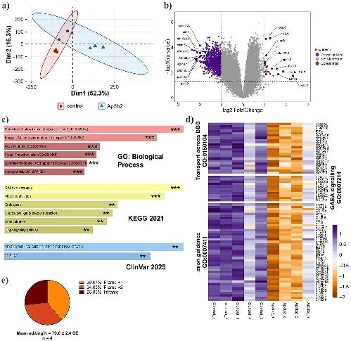 ap3b2 disruption downregulates BBB transport, GABA signaling, and axon guidance pathways in CRISPant tadpole brains. (a) PCA plot of normalized read counts of the five control samples and four ap3b2−/− (mosaic) samples; each sample is derived from six pooled brains. (b) Volcano plot of EdgeR differentially expressed genes (DEG) with FDR threshold of <0.05 and Log2 fold change of >1. The 10 most significant up and down regulated genes are labelled. (c) Selected overrepresented ontologies calculated with EnrichR for down regulated DEG; the top 6 hits are shown for GO: biological process and KEGG_2021; for ClinVar, the only two significant hits are shown (PAdj <0.05). (d) Heatmap of z-scores for three down overrepresented ontologies, down regulated in CRISPants. PAdj ** < 0.01, *** < 0.001. (e) Summary of tadpole editing for ap3b2 CRISPant samples (pooled data corresponding to each of the 4 CRISPR brain transcriptomes), confirmed by Sanger sequencing and TIDE analysis. Supplementary Data for (c,e), as well as the custom brain background gene list, can be found in Supplementary File S1. |