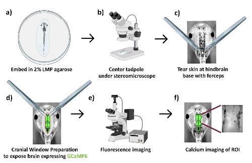 Figure S 3. Workflow for cranial window preparation and calcium imaging in Xenopus tadpoles. a) Tadpole embedded dorsal-up in 2% LMP agarose with nares/mouth free. b) Specimen centered under a stereomicroscope. c) Initial skin tear at the hindbrain base using fine forceps (Dumont #5). d) Cranial window preparation: skin is peeled anteriorly to expose the dorsal brain (hindbrain → midbrain → forebrain) expressing GCaMP6s. e) Transfer to the fluorescence microscope for imaging. f) Calcium imaging of defined brain regions (ROIs); inset illustrates a representative field used for time-series extraction. Arrows indicate the order of operations. Created in BioRender. Banerjee, S. (2026) https://BioRender.com/1m35lxo. |