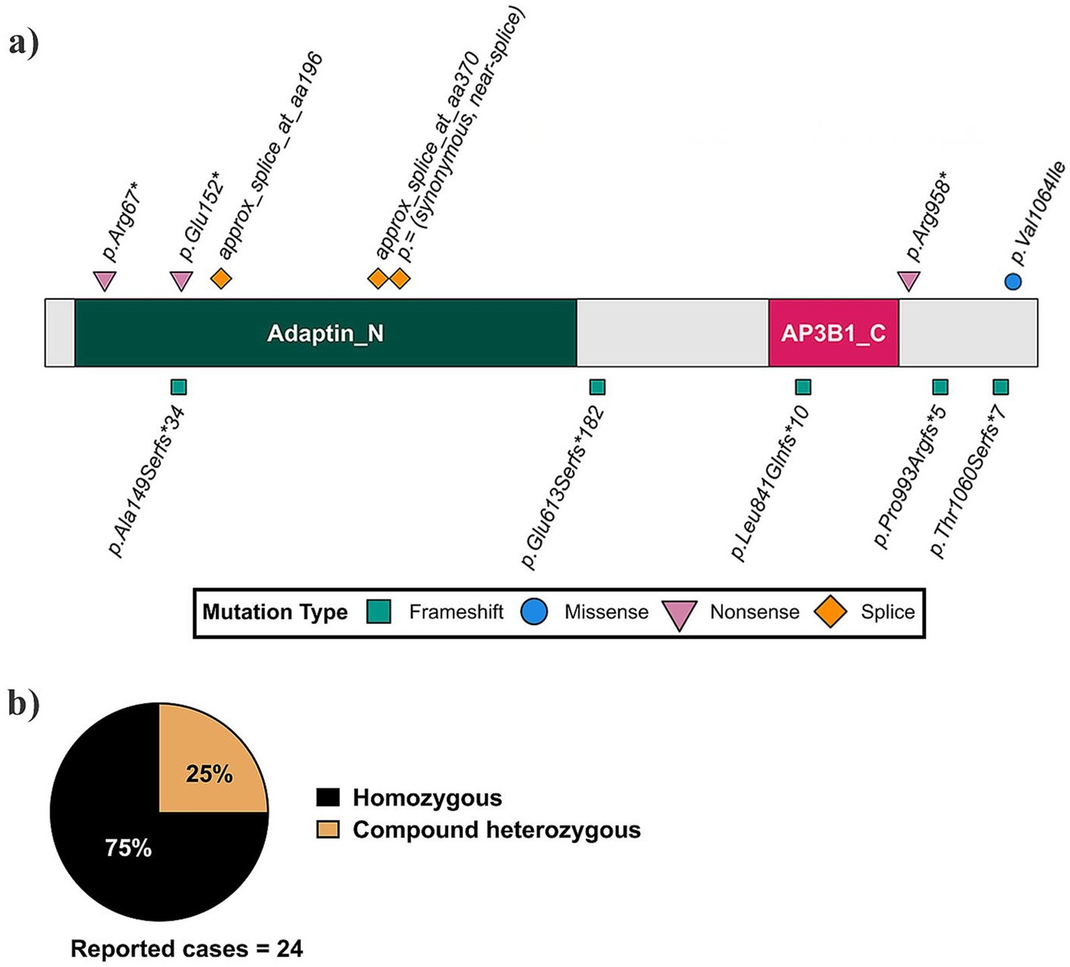 Summary of reported AP3B2 mutations and inheritance patterns in patients. (a) Schematic representation of the human AP3B2 protein showing the locations and types of reported pathogenic variants. The conserved adaptin N terminal (Adaptin_N) and clathrin-adaptor complex-3 beta-1 subunit C-terminal (AP3B1_C) domains are indicated, with frameshift (green squares), missense (blue circle), nonsense (pink triangles), and splice-site (orange diamonds) mutations annotated along the protein. (b) Summary of reported inheritance patterns across 24 documented cases, 75% were homozygous for AP3B2 variants, while 25% are compound heterozygous. The DEE48 pathogenic variants in AP3B2 shown here were described in Assoum et al. (7), Anazi et al. (9), Dilber et al. (8), and Alizadeh et al. (10). |