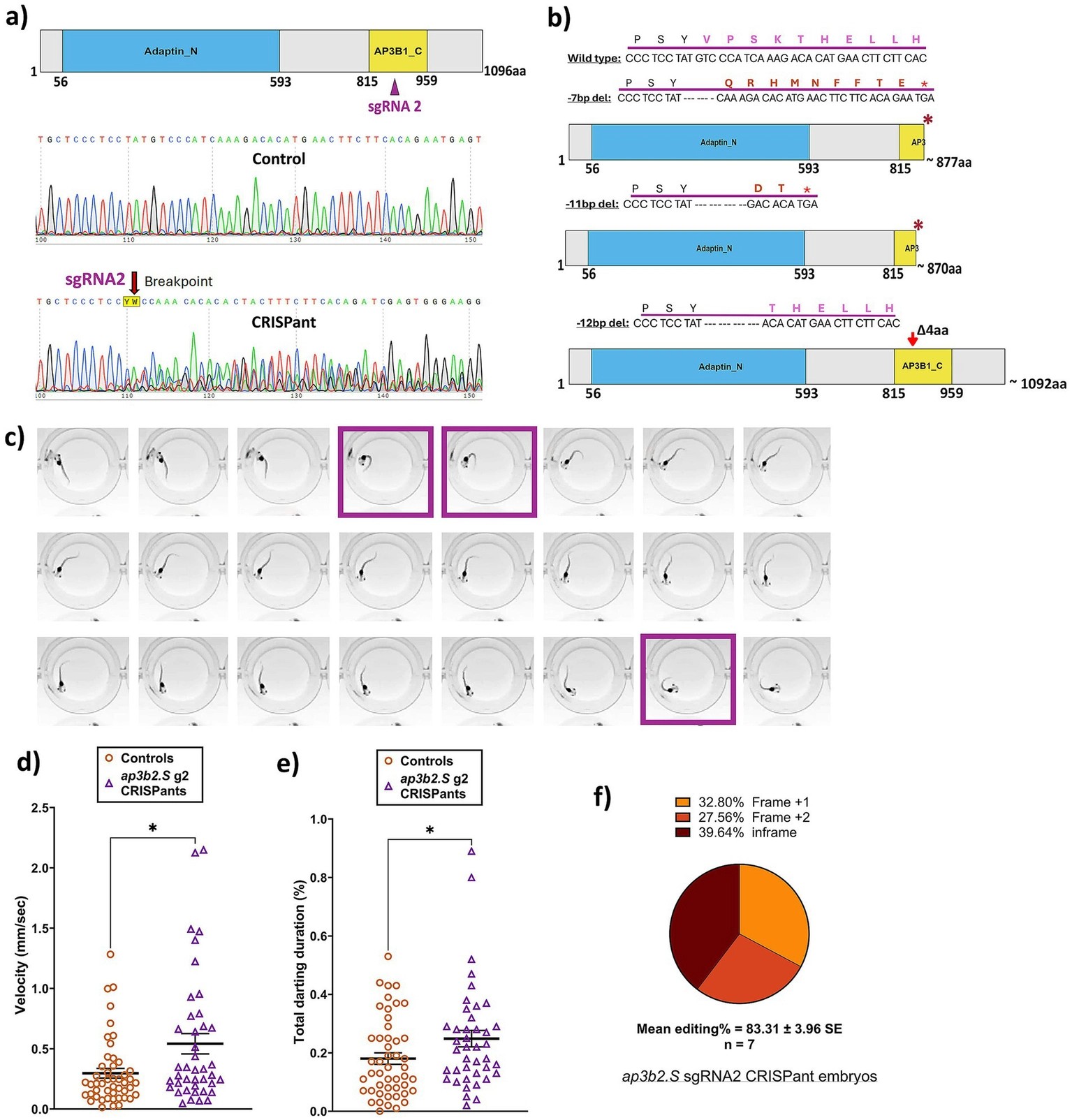 CRISPR/Cas9 disruption of ap3b2 triggers premature protein truncation resulting in hyperactivity and seizure-like behavior in CRISPants. (a) Schematic of the X. laevis Ap3b2. S protein showing the conserved Adaptin_N and AP3B1_C domains. sgRNA2 target site is indicated, along with representative Sanger sequencing traces show degradation at the sgRNA2 cut site. (b) Predicted protein outcomes for the three most observed indels (−7, −11, and −12 bp deletions) generated by sgRNA2. (c) Representative frames from behavioral recordings at 50 fps of an ap3b2 CRISPant tadpole. Frames highlighted in purple boxes show characteristic seizure-related C-shaped darting behavior observed in CRISPants. (d,e) Comparison of (d) mean swim velocity (mm/s) and (e) time spent in darting behavior (%) between ap3b2 CRISPants (N = 41) compared with sibling controls (N = 48), unpaired t-test with Mann–Whitney, *p < 0.05. Horizontal bars indicate group means and error bars denote SEM. (f) Summary of CRISPR/Cas9 editing outcomes in 7 arbitrarily selected ap3b2 CRISPant embryos from the same batch used in the behavior experiments, confirmed by Sanger sequencing and TIDE analysis. Raw count data and statistical analysis can be found in Supplementary File S1. |