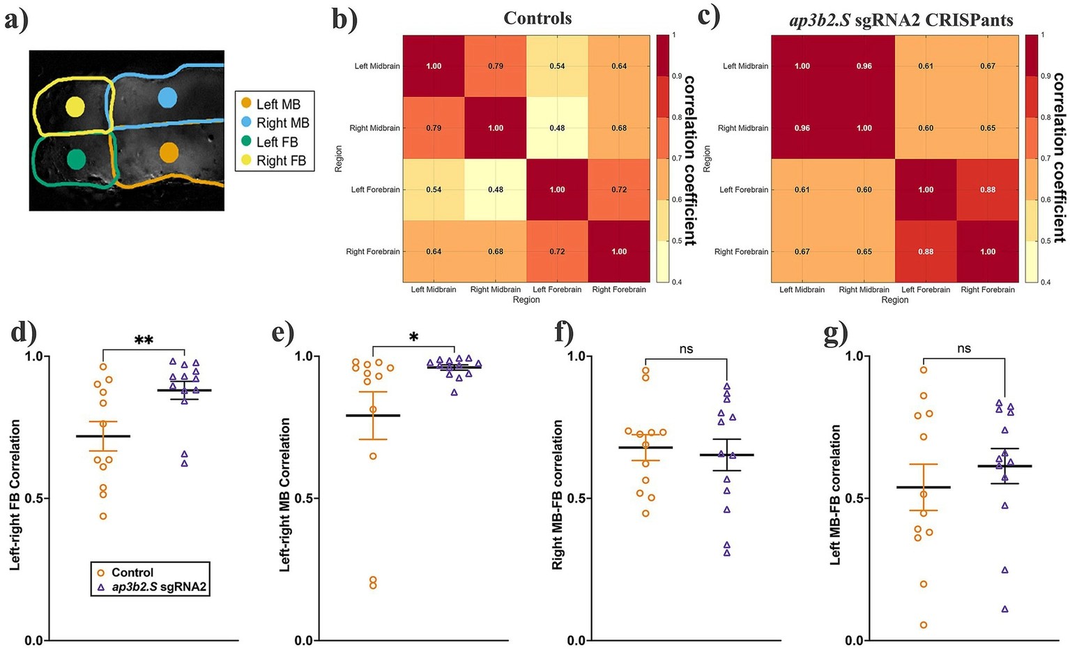 ap3b2 CRISPants exhibit increased interhemispheric synchrony in the midbrain and forebrain. (a) Schematic example illustrating the centroid-based regions of interest (ROIs) used for interregional correlation analysis. Fixed-area central ROIs (500 pixels each) were positioned at the geometric centroids of the left and right midbrain (MB), left and right forebrain (FB). (b,c) Group-averaged Pearson correlation coefficient matrices for unedited control tadpoles (b, N = 12) and ap3b2 CRISPants (c, N = 13). (d,e) Comparison of brain regional synchrony, quantified as Pearson correlation coefficients, in controls and ap3b2 CRISPants. Regions compared are (d) left–right MB and (e) left–right FB. Unpaired t-test with Mann Whitney, *p < 0.05, **p < 0.01. (f,g) Correlations between (f) right MB-FB and (g) left MB-FB, unpaired t-tests with Mann Whitney, ns, not significant. Raw correlation values and full statistical details are provided in Supplementary File S1. |