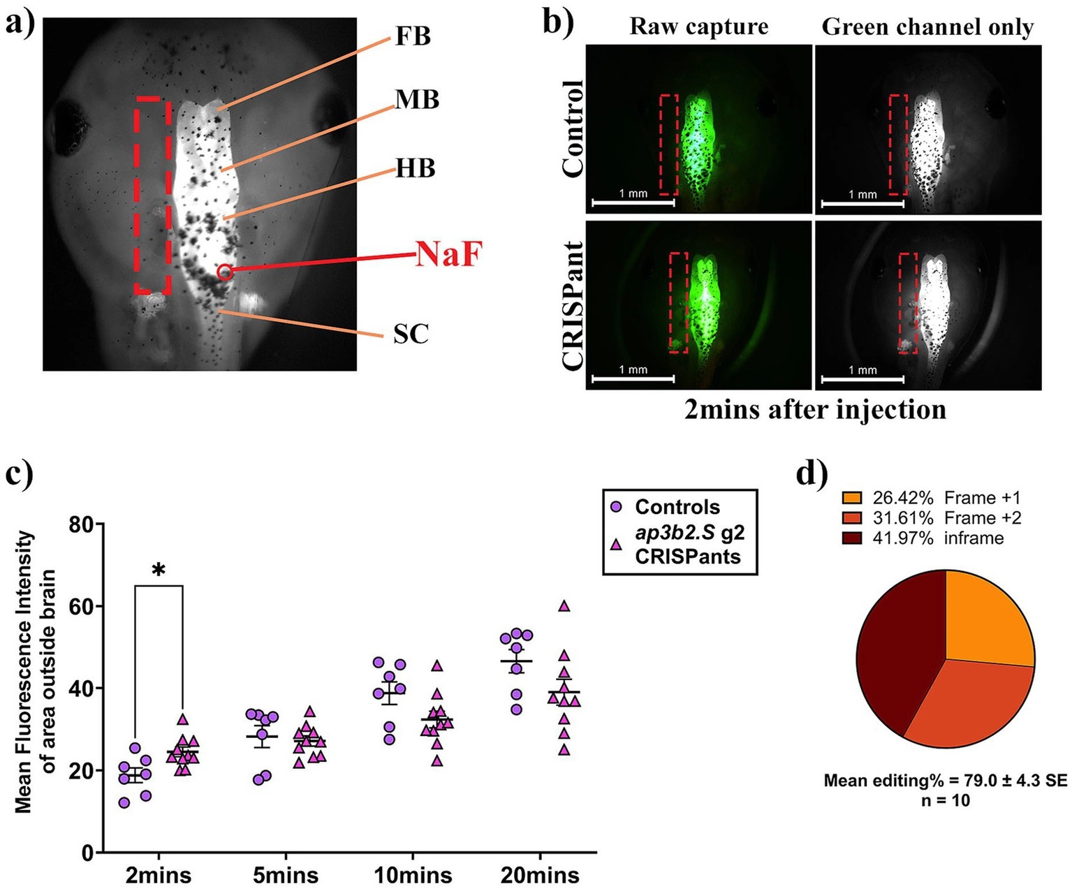 Rapid early sodium fluorescein dye leakage in ap3b2 CRISPants reveals a markedly compromised BBB. (a) Schematic dorsal view of an NF stage 47 X. laevis tadpole head showing forebrain (FB), midbrain (MB), hindbrain (HB), and spinal cord (SC), and the site of sodium fluorescein (NaF) microinjection into the 4th ventricle (red arrow). The dashed rectangle indicates the ROI outside the brain from which fluorescence intensity was quantified. (b) Representative images of NaF-injected controls (top row) and ap3b2.S CRISPants (bottom row) 2 min after microinjection (raw capture and green channel only). (c) Plot of mean fluorescence intensity (MFI) detected outside tadpole brain at 2, 5, 10, and 20 min post NaF injection in CRISPant tadpoles (N = 10) compared to controls (N = 7), repeated measures 2-way ANOVA with Tukey’s multiple comparisons test, *p < 0.05. (d) Summary of CRISPR/Cas9 editing outcomes in the CRISPant group, determined by Sanger sequencing and TIDE analysis. Raw count data and full statistical details are provided in Supplementary File S1. |