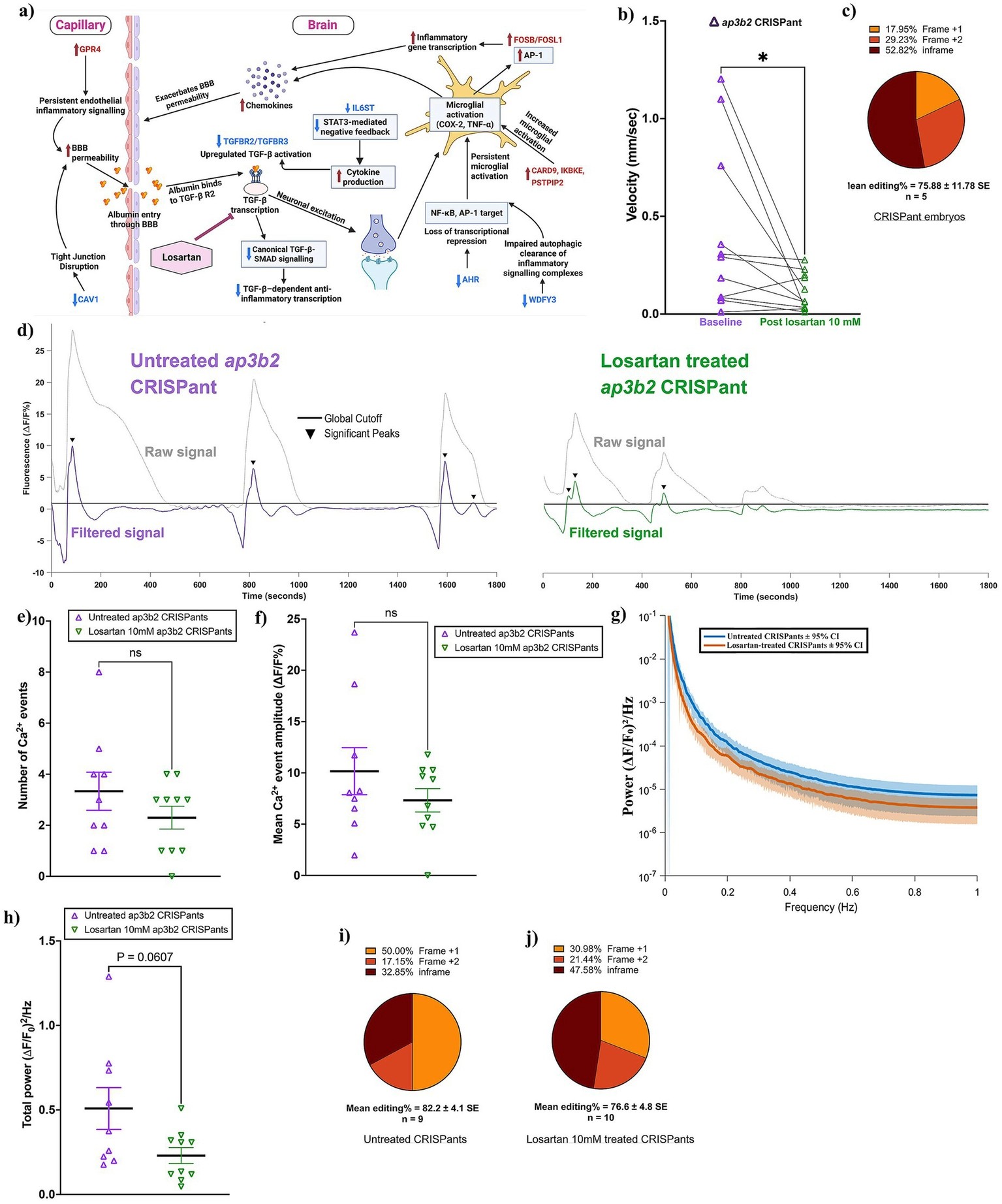 Losartan treatment reduces aberrant calcium activity and hyperactivity in ap3b2 CRISPants. (a) Conceptual schematic of ap3b2 CRISPant differentially expressed genes associated with loss of anti-inflammatory regulatory control, BBB dysfunction, and neuronal hyperexcitability relevant to TGF-β receptor–SMAD signaling, indicating a hypothetical mode of action for losartan (created in BioRender). (b) Paired comparison of mean swim velocity (mm/s, over 1 h) in ap3b2 CRISPant tadpoles before and after 10 mM losartan treatment. Lines connect individual tadpoles, and the effect of losartan was tested using a Wilcoxon paired t-test, *p < 0.05. (c) Summary of CRISPR/Cas9 editing outcomes for embryos used in the losartan phenotype experiments, determined by Sanger sequencing and TIDE analysis. (d) Representative whole-brain Ca2+ signals (raw and filtered ΔF/F₀ traces) showing activity from untreated ap3b2.S CRISPants (left) and losartan-treated CRISPants (1 h, 10 mM, right). Black lines indicate the global event detection threshold (3 × control SD), with arrowheads marking significant Ca2+ events. (e,f) Comparison of the numbers of Ca2+ events (e) and mean event amplitude (f) detected in untreated (N = 9) and losartan treated (10 mM; N = 10) ap3b2 CRISPant tadpoles. Groups were compared using unpaired Welch’s t-tests, ns = not significant (p > 0.05). (g) FFT-derived power spectral densities of spontaneous whole-brain Ca2+ activity in untreated and losartan-treated ap3b2 CRISPants, plotted on a logarithmic scale. Solid lines indicate group means and shaded envelopes represent 95% confidence intervals across animals. (h) Comparison of integrated low-frequency spectral power density (0.01–1 Hz; (ΔF/F₀)2/Hz) between untreated (N = 9) and losartan-treated (10 mM, N = 10) ap3b2 CRISPants. Individual data points on scatterplots represent single CRISPant tadpoles; horizontal bars denote group means and error bars indicate SEM. Statistical significance was assessed an unpaired Welch’s t-test, with the exact p value shown. (i,j) Distribution of CRISPR editing outcomes in untreated (i) and losartan-treated (j) CRISPant tadpoles, quantified by Sanger sequencing and TIDE analysis. Raw data and full statistical analyses are provided in Supplementary File S1. |