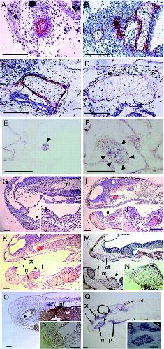 Fig 3. Type II Collagen protein and mRNA expression in the explants and general embryos. The serial sections of the histologically analyzed explants and the sections of general embryos were immunostained with anti-Col2 antibody which was visualized with AEC and counterstained with hematoxylin. The sections of explants and general embryos were hybridized with DIG-labeled Col2 RNA probe, and the localization was visualized with NBT/BCIP. (A) Immunolocalization of Col2 in the serial section of Fig. 2 B, the 4 day-cultured explant. (B) Immunolocalization of Col2 in the serial section of Fig. 2 C, 7 day-cultured explant. (C) Immunolocalization of Col2 in the serial section of Fig. 2 D, 10 day-cultured explant. (D) Immunolocalization of Col2 in the serial section of Fig. 2 F, 14 day-cultured explant. (E) Col2 mRNA expression in the section of 4 day-cultured explant. (F) Col2 mRNA expression in the section of 7 day-cultured explant. (G) Immunolocalization of Col2 in the section of Stage 35 embryo. (H) Higher magnification of the arrowhead indicating area in G. (I) Immunolocalization of Col2 in the section of Stage 40 embryo. (J) Higher magnification of the arrowhead indicating area in I. (K) Immunolocalization of Col2 in the section of Stage 42 embryo. (L) Higher magnification of the arrowhead indicating area in K. (M) Immunolocalization of Col2 in the section of Stage 44 embryo. (N) Higher magnification of the arrowhead indicating area in M. (O) Col2 mRNA expression in the section of Stage 35 embryo. (P) Higher magnification of indicating area in O. (Q) Col2 mRNA expression in the section of Stage 44 embryo. (R) Higher magnification of indicating area in Q. et, ethmoid trabecular cartilage; ir, infrarostralcartilage; m, Meckel's cartilage; nt, notochord; pq, palatoquadratecartilage. (Bars = 50 μm.)