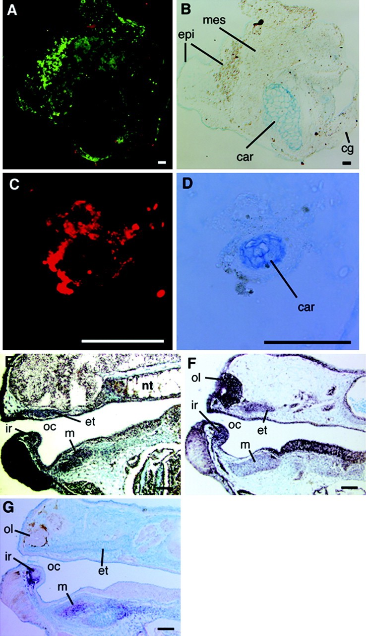 Fig 5. Expression of Cart-1, X-dll4, and gsc mRNA in the cartilage of the explants and general embryos by in situ hybridization. The Alcian blue-stained section of a 7 day-cultured explant was double-stained with DIG-labeled Cart-1 probe and fluorescein-labeled X-dll4 RNA probes, visualized with Cyanine 3 and fluorescein, respectively. The serial section of above section was stained with DIG-labeled gsc RNA probe and visualized with Cyanine 3. The Alcian blue-stained sections of stage 41 general embryos were stained with DIG-labeled RNA probes and visualized with NBT/BCIP (purple). (A) Cart-1 mRNA (red) and X-dll4 mRNA (green) expression in a section of 7 day-cultured explant. (B) The Alcian blue staining of A. (C) gsc mRNA (red) in the serial section of A. (D) The Alcian blue-stained staining of C. (E) Cart-1 mRNA expression in embryo. (F) X-dll4 mRNA expression in embryos. (G) gsc mRNA expression in embryo. cg, cement gland; et, ethmoid trabecular cartilage; ir, infrarostralcartilage; m, Meckel's cartilage; nt, notochord; oc, oral cavity; ol, olfactory organ; pq, palatoquadratecartilage. (Bars = 10 μm.)