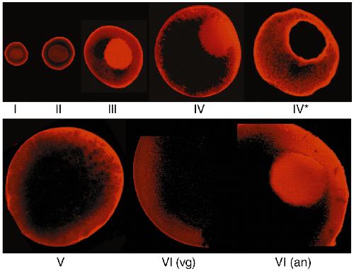 Distribution of VgRBP71 during oogenesis. Staged oocytes were processed for immunocytochemical analysis using affinity purified antibody prepared against VgRBP71 and a secondary antibody conjugated with Alexa Fluor 568. Stage III through V oocytes are oriented with the vegetal pole at the lower left corner. The stage IV oocyte marked with an asterisk (IV*) was bisected along the animal-vegetal axis prior to immunochemical staining. The images marked VI(vg) and VI(an) are the vegetal and animal hemispheres, respectively, of a stage VI oocyte.