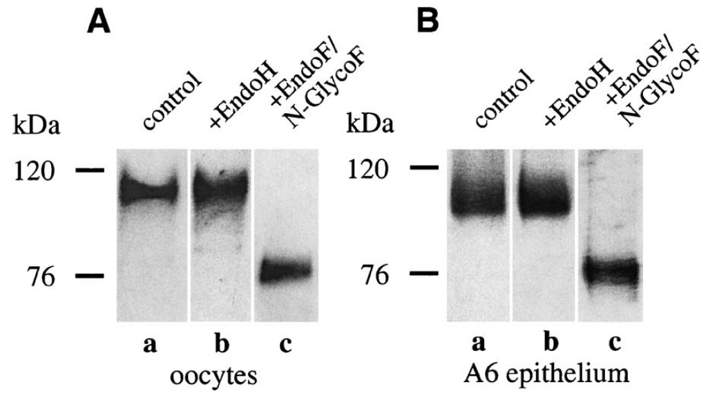 Endoglycosidase H digestion had no effect on xClC-3 from injected oocytes and A6 cells. For both samples, digestion with the endoglycosidase F/Nglycosidase