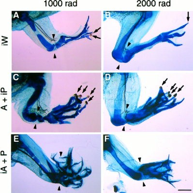 Figure 8. Digit patterns in X-rayâirradiated recombinants. A,B: Recombinants with irradiated whole limbmesenchyme (iW). Both anterior (with claws) and posterior (without claws) digits were formed. C,D: Recombinants with nonirradiated anterior cells and irradiated posterior cells (A + iP). E,F: Recombinants with irradiated anterior cells and nonirradiated posterior cells (iA + P). Mesenchyme was irradiated with 1,000 rad (A,C,E) or 2,000 rad (B,D,F). Arrows indicate claws on the digit tip. Arrowheads show the hostâgraft boundary. Scale bar = 1 mm in F (applies to AâF).