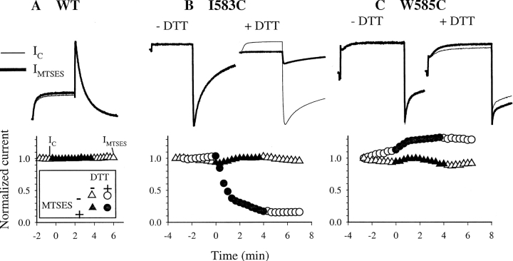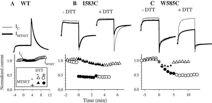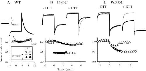 Figure 3. . MTSET has no effects on WT HERG (A), and its effects on I583C (B) and W585C (C) are enhanced by DTT pretreatment. In each panel, the upper part illustrates superimposed current traces under the control conditions (IC, thin trace) and after MTSET treatment (IMTSET, thick trace). IC is measured right before MTSET exposure, and IMTSET is measured after MTSET washout. An example of the time points at which IC and IMTSET are sampled is denoted in the time course of A. WT HERG has no DTT-treatment. I583C and W585C are either not DTT-treated (−DTT), or DTT-pretreated (+DTT, 5 mM for up to 4 h). −DTT and +DTT data are from different cells. The lower parts show time courses of changes in the peak amplitude of tail current before, during and after MTSET exposure from the same experiments as shown in the upper parts. Time zero marks the beginning of MTSET (1 mM) superfusion. Open symbols are data points recorded before and after MTSET exposure, whereas closed symbols are those during MTSET exposure. Triangles denote data from cells without DTT treatment, and circles are data from cells pretreated with DTT. (A) WT HERG recorded in 2 mM [K]o, channel is activated by 1-s depolarization pulses to 20 mV, and tail currents are recorded at −80 mV. (B) I583C recorded in 2 mM [K]o, activated by 1-s depolarization to 60 mV, tail currents recorded at −80 mV. (C) W585C recorded in 98 mM [K]o, activated by 1-s depolarization to 20 mV, tail currents recorded at −120 mV. |