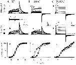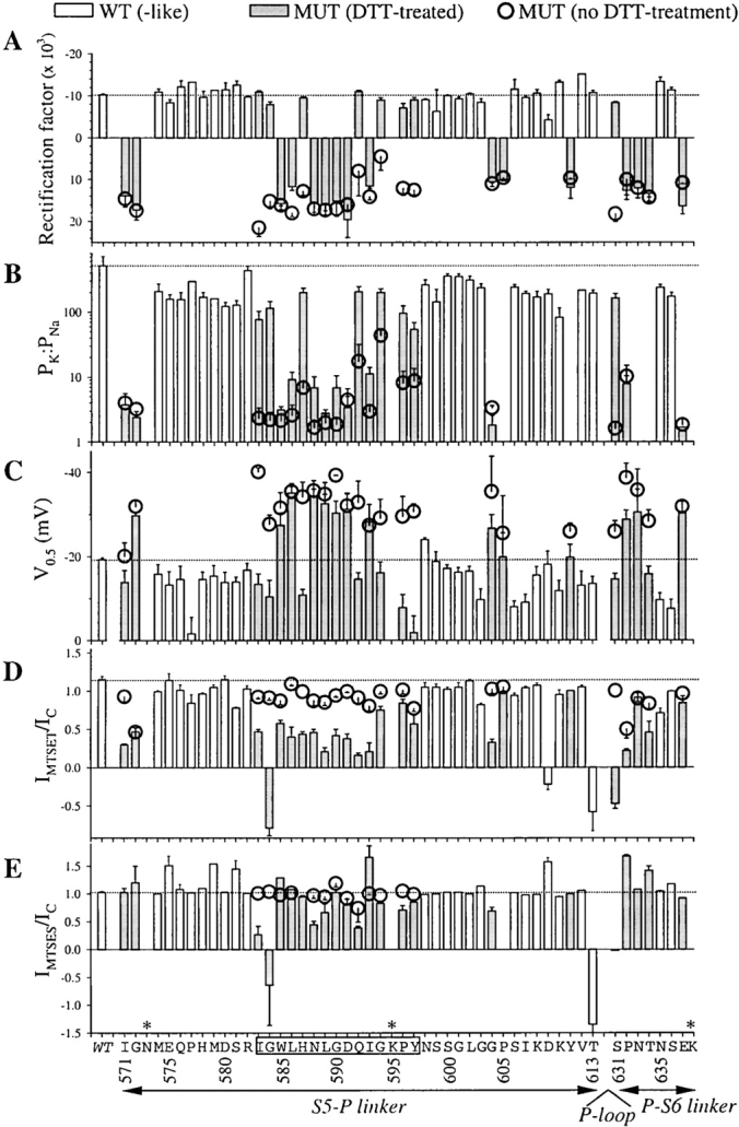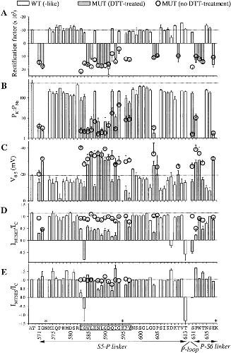 Figure 6. . Summary of effects of cysteine substitutions in the S5-P and P-S6 linkers of HERG on the degree of C-type inactivation (A), K+ ion selectivity (B), half-maximum activation voltage (C), response to MTSET (D), and response to MTSES (E). For all panels, white histogram bars denote data from WT HERG and WT-like mutants, gray histogram bars are data from mutants with altered behavior (MUT) after DTT treatment (5 mM, up to 4 h), and open circles are data from MUT without DTT treatment. Dotted lines are drawn across the WT data to facilitate comparison. Data are plotted against WT residues along the abscissa, with selected position numbers marked. The 583â597 segment is boxed. The channel domains (S5-P and P-S6 linkers, with P-loop in between) are also denoted. Asterisk indicates no expression (N573C, K595C, and K638C). (A) The degree of C-type inactivation is measured by a ârectification factorâ calculated from the normalized tail I-V relationship as shown in Fig. 2: Rectification factor = [(I+30 â Iâ60)/90], where I+30 and Iâ60 are the normalized tail currents at +30 and â60 mV, respectively. (B) K+ ion selectivity is measured by the permeability ratio of K+ to Na+ (PK/PNa). This is calculated from the reversal potential (Erev) measured in 2 mM [K]o and 96 mM [Na]o based on the constant field equation: Erev = RTln[(α[K]o + [Na]o)/(α[K]i + [Na]i)], where α = PK/PNa, [K]i and [Na]i are assumed to be 125 and 10 mM, respectively, R is the gas constant, and T is the absolute temperature. PK/PNa is plotted on a logarithmic scale. Current amplitudes of P605C, Y611C, N633C, and T634C in 2 mM [K]o are too small for a reliable measurement of Erev. (C) Half-maximum activation voltage (V0.5) is obtained by fitting a Boltzmann function to 1-s isochronal activation curves as described for Fig. 5. When there are two Boltzmann components, the V0.5 values reported here correspond to those of the negative (major) component. (D) Effects of MTSET are evaluated by ratio of IMTSET to IC. These current amplitudes are measured as shown in Fig. 3. (E) Effects of MTSES are evaluated in the same manner as described for MTSET, with IC and IMTSES measured as shown in Fig. 4. The negative values of IMTS/IC for G584C, D609C (MTSET but not MTSES), T613C, and S631C indicate a change in tail current direction at â80 mV from outward (IC) to inward (IMTS) (see Fig. 8). |