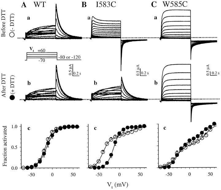 Figure 5. . Effects of cysteine substitution at positions 583 and 585 on the voltage dependence of activation. The voltage clamp protocol is shown in the middle of column A. Superimposed original current traces recorded before DTT treatment (panels a), and after DTT treatment (panels b) from the same oocytes are depicted. Dotted lines denote the zero current level. Panels c illustrate 1-s isochronal activation curves averaged from 5–7 oocytes per group. For each oocyte, tail current amplitudes after depolarization to different levels of Vt are measured and normalized by the maximal tail current after Vt to 60 mV. This gives an estimate of the fraction of channels activated at the end of Vt. The relationship between Vt and “fraction activated” is fit with a single (WT, and I583C after DTT) or double (I583C before DTT, and W585C before/after DTT) Boltzmann function: Fraction activated = A1/{1 + exp[(V1 − Vt)k1]} + A2/{1 + exp[(V2 − Vt)/k2]}, where Ai, Vi, and ki are the fraction, half-maximum activation voltage and slope factor of ith Boltzmann component. For single Boltzmann function, i = 1 only. The superimposed activation curves are calculated from appropriate Boltzmann function with mean parameter values. |