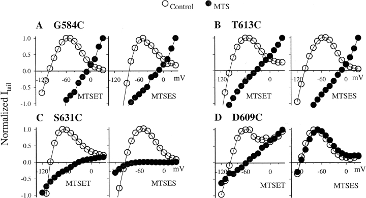 Figure 8. . Effects of MTSET and MTSES on the I-V relationship and Erev of four cysteine mutants: G584C (A), T613C (B), S631C (C), and D609C (D). In all cases oocytes have been DTT treated. The recording conditions, voltage clamp protocol, and data analysis are the same as those described for Fig. 2. After control data (open circles) are obtained, the cells are exposed to MTSET (1 mM) or MTSES (1 mM) while the channels are activated by constant pulses from Vh −80 to 20 mV for 1 s once per 30 or 60 s till changes in currents reach a steady state. The MTS reagents are washed out for ≥10 min and then currents after MTS modification (closed circles) are recorded. |