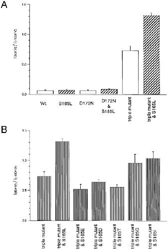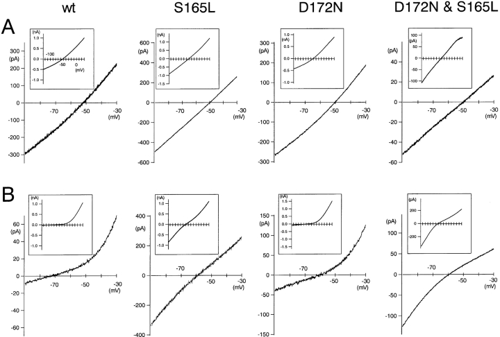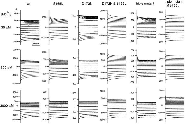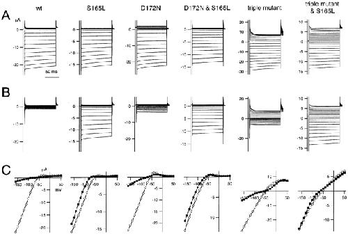 Figure 3. . Macroscopic currents recorded by two-electrode voltage-clamp of Xenopus oocytes expressing various mutants in which S165 in the D172N & E224G & E299Q triple Kir2.1 mutant was substituted with E, D, T, G, or L. The data were recorded and analyzed as in Fig. 2. |