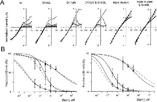 Figure 6. . Comparison of the susceptibility of macroscopic currents through wild-type and mutant Kir2.1 to blockade by intracellular spermine. (A) Normalized I-V relationships; values were measured 3 s after the onset of each step pulse. Current amplitudes were normalized to the values at −90 mV. The symbols stand for spermine concentrations of 0 μM (○), 0.01 μM (▴), 0.1 μM (□), 1 μM (•) 10 μM (+) and 100 μM (▪). (B) Concentration-response relationships for spermine blockade of outward K+ currents at −10 mV (left) and 30 mV (right). A rectification index was calculated first as the ratio of the current amplitudes at −10 mV or 30 mV to that at −90 mV. A value of 1 was then set as 100% for the data at −10 mV (left), and a value of 2 was set as 100% for the data at +30 mV (right). Symbols depict means ± SD (n = 3–7) for wild-type (•), S165L (○), D172N (▴), D172N & S165L (▵), triple mutant (▪), and triple mutant & S165L (□) channels. Solid lines (S165) and dotted lines (with S165L mutation) are curves fitted to Hill's equation. |