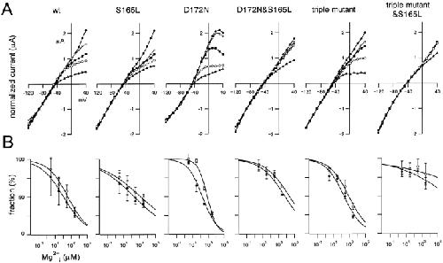 Figure 8. . Comparison of the susceptibility of macroscopic currents through wild-type and mutant Kir2.1 to blockade by intracellular Mg2+. (A) Normalized I-V relationships. Values were measured 500 ms after the onset of each step pulse. The symbols stand for Mg2+ concentrations of: 0 μM (•), 3 μM (+), 30 μM (▪), 300 μM (○), and 3,000 μM (▴). The current amplitudes were normalized to the values at −90 mV. (B) Dose–response relationships for Mg2+i blockade of outward K+ currents at −10 mV (○) and at 30 mV (•). The rectification index was calculated first as the ratio of the current amplitudes at −10 or 30 mV to that at −90 mV. A value of 1 was set as 100% for the data at −10 mV, and a value of 2 was set for the data at 30 mV. Symbols depict means ± SD (n = 3–7). To improve the fitting, the rectification index of 1.75 at 30 mV was set as 100% in the case of the D172N mutant, and 2.25 was set as 100% in the case of the triple & S165L mutant. This is thought to be because of changes in rectification properties in the absence of blockers. |
