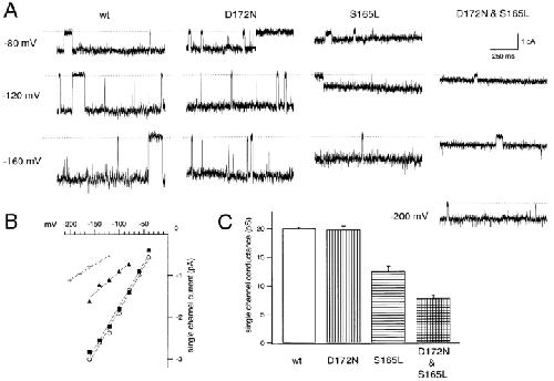 Figure 12. . Comparison of single-channel currents through the wild-type Kir2.1 and the mutants. (A) Representative single-channel currents recorded from Xenopus oocytes using the cell-attached patch configuration. The K+o in the pipette and in the bath were 140 mM. The holding potential for the displayed recordings were −80, −120, and −160 mV for the wild-type, D172N, and S165L channels, and were −120, −160, and −200 mV for the D172N & S165L double mutant. The dashed lines indicate the zero current level after subtracting the leak current. (B) Relationship of single-channel current amplitude and holding potential for wild-type (○), D172N (▪), S165L (▴), and D172N & S165L (+) channels. (C) Single-channel conductance calculated from the slopes of the plots in B; plotted are means ± SD (n = 4–6). |