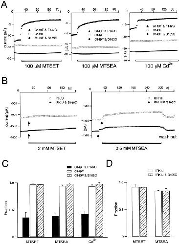 Figure 13. . Accessibility of S165C by cys-modifying reagents from extracellular and intracellular sides. (A) Currents recorded under two-electrode voltage clamp from Xenopus oocytes. The effects of either 100 μM MTSET, 100 μM MTSEA, or 100 μM Cd2+ were shown. The symbols are (○), C149F (negative control); (▴), C149F & F147C (positive control); and (•), C149F & S165C. Test pulses for 100 ms were given every 2 s to −130 mV from a holding potential of −30 mV, and current amplitudes were measured at 50 ms from the onset of each test pulse. (B) Currents recorded from transfected HEK293T cells under inside-out patch clamp. The effects of 2 mM MTSET or 2.5 mM MTSEA were analyzed. Test pulses for 200 ms were given every 3 s to −120 mV from a holding potential of −50 mV, and current amplitudes were measured at 100 ms from the onset of each test pulse. (C and D) Fractions of the residual current amplitudes after application of cys-modifying reagents from extracellular side at 120 s (C) and from intracellular side at 180 s (D). The values of means ± SD (n = 4) are shown. |
