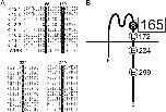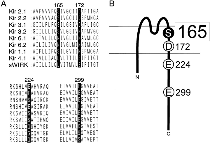 Figure 1. . Conservation of four amino acid residues critical for inward rectification among the inward rectifier K+ channel family. (A) Alignment of the amino acid sequences of the inwardly rectifying K+ channel family at D172, E224, E299, and E165 of Kir2.1 and the surrounding region. The original reports used for the alignment are as follows. Kir 2.1 (Kubo et al., 1993a), Kir 2.2 (Koyama et al., 1994), Kir 3.1 (Kubo et al., 1993b), Kir 3.2 (Lesage et al., 1994), Kir 6.1 (Inagaki et al., 1995a), Kir 6.2 (Inagaki et al., 1995b), Kir 1.1 (Ho et al., 1993), Kir 4.1 (Bond et al., 1994; Takumi et al., 1995), and sWIRK (Kubo et al., 1996). (B) Schematic diagram of the structure of Kir2.1 based on the initial model by Kubo et al. (1993a). Both D172 and S165L are located within the α-helix of the second transmembrane region (M2). E224, situated just after M2, and E299, situated at the center of the putative cytoplasmic chain after M2, are also depicted. |