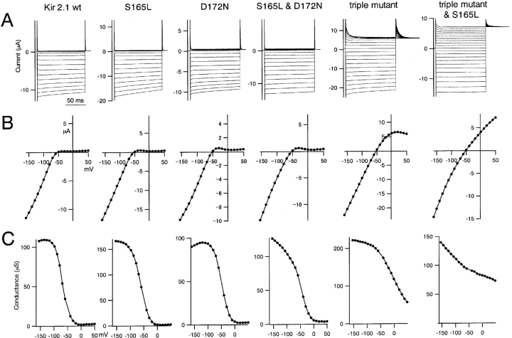 Figure 2. . Comparison of macroscopic currents through wild-type and mutant Kir2.1 expressed in Xenopus oocytes. (A) Macroscopic currents recorded using two-electrode voltage clamp with Xenopus oocytes expressing wild-type Kir2.1 or S165L, D172N, D172N, & S165L double mutant, D172N & E224G & E299S triple mutant, or triple mutant & S165L. Representative current traces recorded in 10 mM K+o. The holding potential was −50 mV; step pulses from 50 to −160 mV were applied in 10-mV decrements. (B) I-V relationships for the data in A; values were measured 50 ms after the onset each step pulse. (C) Conductance-voltage (G-V) relationship for the data in B. |