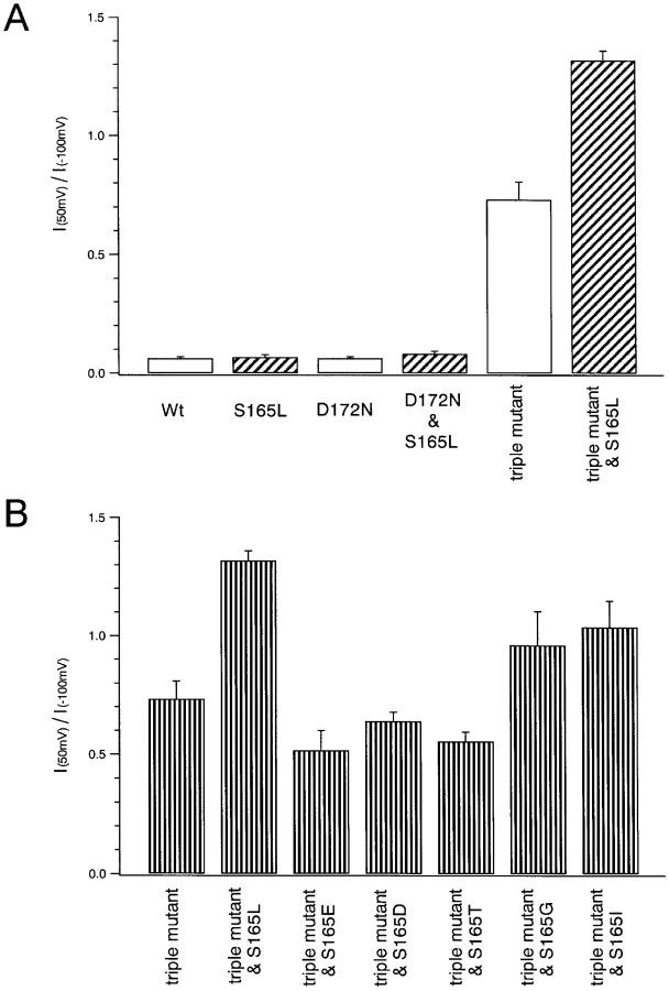 Figure 4. . Inward rectification of currents through wild-type and mutant Kir2.1. (A and B) The ratios of the current amplitudes measured 50 ms after the onset of step pulses to 50 and −100 mV were calculated as an index of rectification intensity. Bars depict means ± SD (n = 4 of each group). A and B reflect the data shown in Figs. 2 and 3, respectively. |