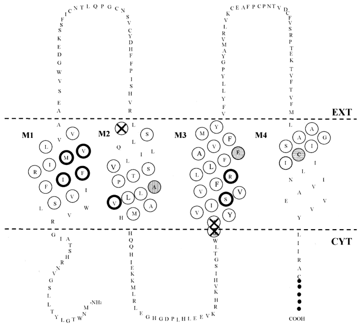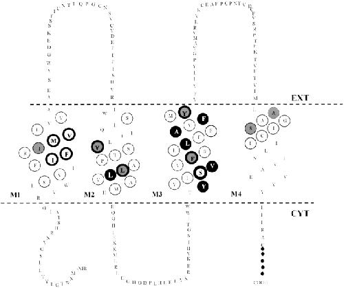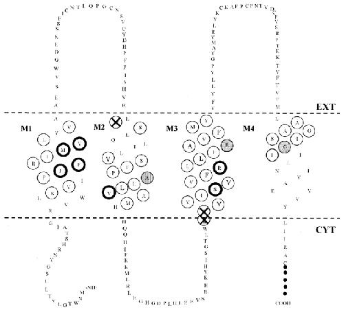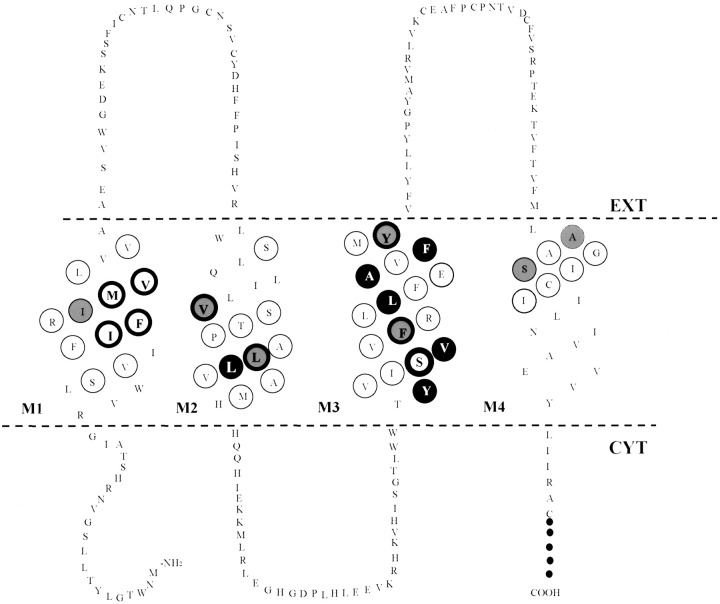 Figure 8. Position of all significantly reactive cysteines in Cx32. Solid filled circles in M2 and M3 indicate sites where channel block by MBB was highly significant (P < 0.01), whereas boldly circled residues with lighter shading (V84 and L89 in M2; F141 and Y151 in M3) showed conductance changes that were slightly less significant (0.01 < P < 0.05). Lightly shaded residues in M1 (I33) and M4 (A196 and S198) showed block in response to extracellular MBB application, and are not thought to line the pore. Boldly circled open sites indicate reactive positions where cysteine substitution induced reversed gating. Reactivity of these residues suggests that they are accessible in the closed state, but not necessarily in the native, open conformation. |