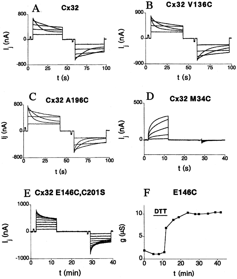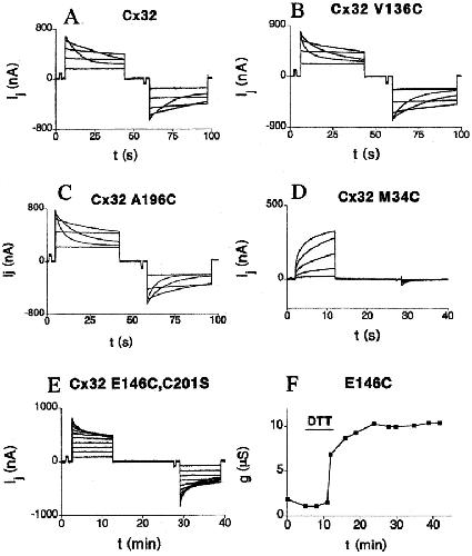Figure 3. Transjunctional currents recorded from paired Xenopus oocytes expressing wtCx32 and several representative cysteine substitution mutants. Oocytes expressing mutants V136C (B), A196C (C), and E146CC201S (E) were paired homotypically (mutant/mutant), and showed gating responses minimally modified from wild-type Cx32 (A). Note that the E146C mutant alone was nonfunctional, and currents could only be recorded for the double mutant or after DTT perfusion of the single mutant (F). (D) M34C was paired heterotypically with wtCx32, with positive polarity defined relative to the mutant-expressing oocyte. These channels, which are closed at rest and open in response to positive transjunctional voltages, are an example of the reverse-gating phenotype discussed in Fig. 2 and the text. In all cases, transjunctional currents were recorded from oocytes clamped at −40 mV, whereas the partner was pulsed in 20-mV increments from the same holding potential. |