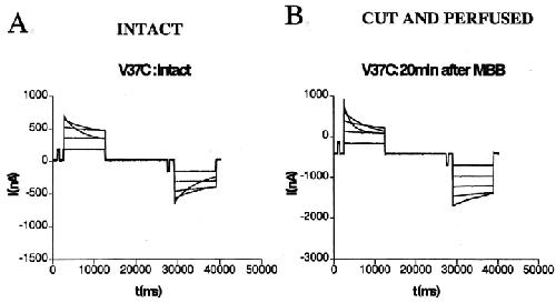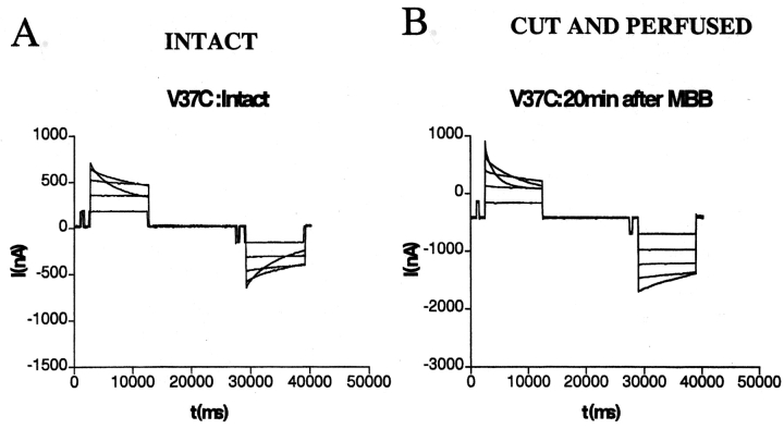 Figure 4. Transjunctional currents recorded from paired Xenopus oocytes expressing Cx32V37C show minimal changes on perfusion. Oocytes were paired homotypically (mutant/ mutant) in the perfusion chamber, and voltage sensitivity of the junctions was assessed in the intact (A) and perfused (B) configuration. Junctional currents were altered only slightly after perfusion. Transjunctional currents were recorded from the intact oocyte clamped at −20 mV, whereas the partner was pulsed in 20-mV increments from the same holding potential. |