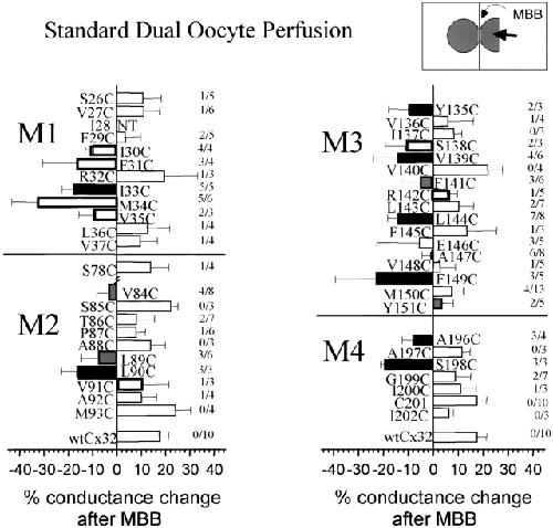 Figure 6. Mean percent changes in conductance after MBB perfusion. For Cx32 and the majority of cysteine substitution mutants, a small increase in conductance occurs after addition of the reagent, which represents a continuation of the trend in conductance before the application of MBB (open bars). A significant decrease in conductance compared to wt was observed after application of MBB to a number of cysteine substitution mutants (black bars, P < 0.01; shaded bars, 0.01 < P < 0.05). In all of these cases, block was also observed in ≥50% of perfusions (>60% for black bars). Bolded open bars indicate sites where cysteine substitution altered the gating properties of the channel. Hence, reactivity does not necessarily infer that the native amino acid lies in an accessible position. Error bars represent SEM. Numbers adjacent to the bars indicate the number of experiments where conductance was reduced versus the number of experiments conducted. |