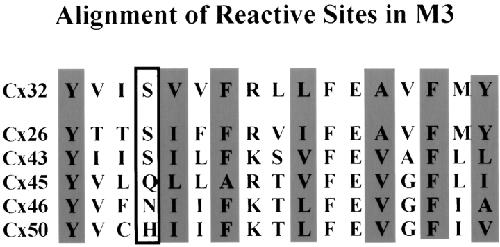 Figure 10. Aligned amino acid sequences for the third transmembrane domain of Cx32 and several other connexins. Highlighted residues indicate pore-lining residues in Cx32 and their corresponding sites in other characterized connexins (open-boxed site only tested in the closed state). The periodicity in the NH2-terminal two-thirds of M3 suggests α-helix, but this breaks down at the COOH-terminal end. Many sites are strictly conserved, whereas others show relatively minor changes despite reports of significant differences in permeability between connexins. This suggests that subtle differences in residue length or branching may define the affinity of binding sites within the pore. |