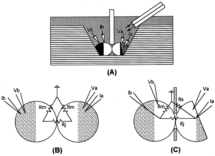 Figure 1. Schematic representation of the dual oocyte perfusion apparatus that allows both cytoplasmic access to gap junction channels and monitoring of intercellular conductance. The chambers, designed by F. Cao, B.J. Nicholson, and G. Nottingham (Cao, 1997), are assembled from two halves to form compartments that remain separated by a thin coverslip with a small (0.7-mm diam) hole drilled centrally (A). Oocytes, in 600 µl of L15 media per compartment, establish coupling through the hole in the coverslip, with which the oocyte membrane forms a low resistance seal. During perfusion experiments, one oocyte is cut open with fine dissecting scissors, and at this time, the seal resistance replaces the membrane resistance of the open cell as shown in the equivalent circuit (B and C). |