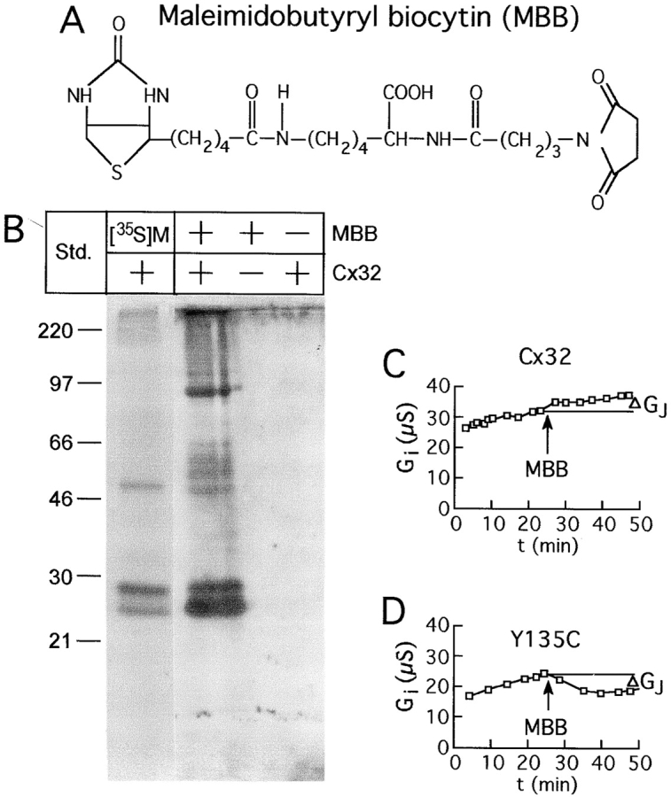 Figure 5. Structure of the thiol reagent maleimidobutyryl biocytin (MBB), and detection of its reactivity with Cx32 in the perfusion chamber. (A) Irreversible reaction occurs between the SH group of a cysteine and the maleimide ring, with the biotin moiety providing easy detection. (B) Biochemical determination that MBB reacts with Cx32 in the dual-oocyte perfusion system. Radiolabeled Cx32, immunoprecipitated from intact oocytes, shows a full-length and partially degraded form just below the 30-kD marker, and an aggregated dimer at ∼50 kD (left lane). Cx32 detected by avidin blot after intracellular perfusion of a paired oocyte with 1 mM MBB and immunoprecipitation of Cx32 (second lane from left) reveals the same bands, although the increased sensitivity of avidin detection revealed additional aggregated forms, both dimeric (50–60 kD) and trimeric (∼90 kD). No protein is detected for noninjected oocytes exposed to MBB or for perfused Cx32-injected oocytes not exposed to MBB (left two lanes). (C and D) Changes in junctional conductance (Gj) during typical SCAM experiments. In most cases, conductance increased steadily before and after addition of the reagent as shown for wtCx32 (C). In cases where a substituted cysteine was accessible, a decrease in conductance occurred after the addition of MBB, as shown for Cx32Y135C (D). The effect of MBB on each oocyte pair was determined by comparison of the conductance immediately before addition of the reagent, to that 20 min after its application (ΔGj). |
