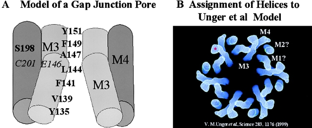 Figure 9. Models of the pore-lining helices of connexins showing reactive sites and the proposed assignment of helices in the gap junction structure. (A) Reactive sites span the length of the M3 helix, which appears to lose its helical periodicity at its extracellular end (displayed as a “break” in the helix). The positioning of M4 is based on the observation that a disulfide bond is capable of forming between C201 in M4, and a substituted cysteine at position 146 in M3. (B) Helical assignments to the gap junction structure of Unger et al. (1999). The main pore-lining helix (M3) is assigned with certainty based on the accessibility of M3 residues in both open and closed channels. The M4 assignment is based on evidence for disulfide formation. There is less certainty regarding the assignments of M1 and M2. It has been proposed (see Discussion; Helical assignments) that the structure shown in B is in the closed state, where M1 would contribute to the pore at the widened cytoplasmic mouth. However, our data indicate that M2 would contribute to the pore mouth in the open state. |
