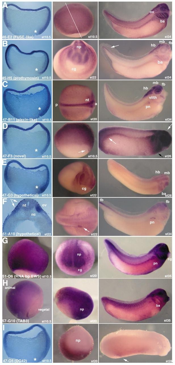 Fig. 4. Whole-mount in situ hybridization of selected clones. (A) Clone 46-E2/FUSE-binding protein is expressed throughout the animal pole of the gastrulaembryo (left and center) and at tadpole stages in the branchial arches and the brain (right panel). (B) Clone 45-H5/prothymosin is expressed at high levels throughout the epithelial layer of the animal pole (left panel) and in anterior neural tissue both at neurula (middle panel) and tadpole stages (right panel). It is also seen in the tailbud (arrow in right panel). (C) Clone 47-B11/plexin, is expressed at gastrula stages throughout the animal pole (left panel). At neurula transcripts are detected throughout the spinal cord and neural tube. At tadpole stages, it is detected in the brain, spinal cord, the facial and trigeminal ganglia, and the pronephros (right). (D) Clone 47-F3/novel is expressed throughout the gastrulaembryo (left and center panels, arrow in middle panel depicts the dorsal blastopore lip). At later stages, expression is very strong in the brain and caudal end of the embryo (white arrows in right panel). It is also detected in ventraltissue (black arrow, right). (E) Clone 47-G3/hypothetical protein is strongly expressed in the animal pole at gastrula stages and in the dorsal blastopore lip (left). High levels are also detected in the nervous system and it is excluded from the cement gland (middle). At tadpole stages (right), it is expressed exclusively in the anterior neural tube. (F) Clone 51-A10/hypothetical protein is expressed at neurula stages in ciliated epidermal cells (arrows, left) and the presumptive otic placodes (arrow in center). In the tadpole (right), notice expression in the nervous system, branchial arches and pronephros. (G) Clone 51-D6/RNA bp EWS is expressed at high levels throughout the gastrulaembryo excluding the vegetal pole (left panel), expression is very high in the anterior neural plate at neurula (middle) and is then expressed throughout the brain at tadpole stage (right). (H) Clone 57-G10/TAB3 is expressed throughout both the embryo at both gastrula and neurula stages (left and middle). At tadpole stage, expression is seen in the brain and branchial arches (right). (I) Clone 47-G6/DG42 is expressed throughout the animal pole in the gastrula (left) and is excluded from the neural plate at neurula stages (center); by tadpole stage it is only expressed in ventral regions of the gut (right, see arrow). a, anterior; ba, branchial arches; cg, cement gland; fb, forebrain; hb, hindbrain; mb, midbrain; nc, notochord; np, neural plate; nt, neural tube; ov, otic vesicle; p, posterior; pn, pronephros; tb, tailbud; viith, facial ganglia; *, dorsal blastopore lip.