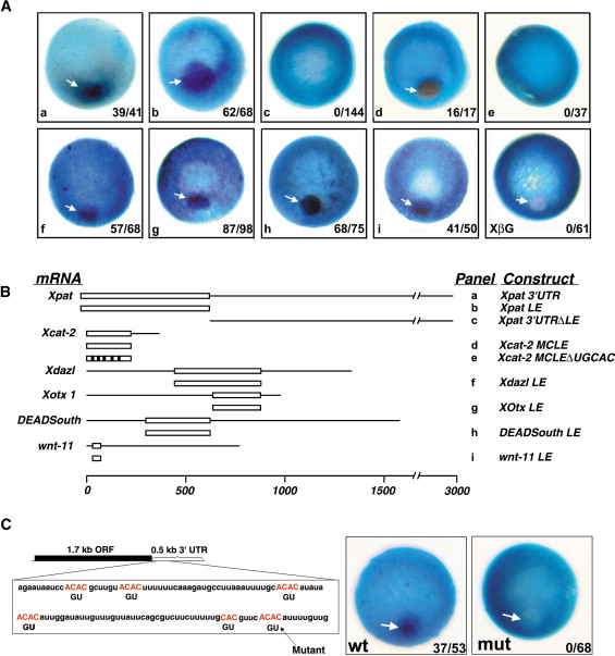 (B) A schematic representation of all six 3â² UTRs is shown, with the name of each construct that was assayed for localization shown at the right and preceded by a letter indicating its corresponding panel in (A). Regions containing the CAC-rich clusters are indicated by open lines with coordinates from the experimental LE column in Table 1. A scale bar in nucleotides is included at the bottom of the figure. Note that all CAC-rich clusters show localization and that removal of the CAC-rich region from the Xpat 3â² UTR (c) or deletion of the UGCAC motifs from Xcat-2 LE (e) abolishes localization.