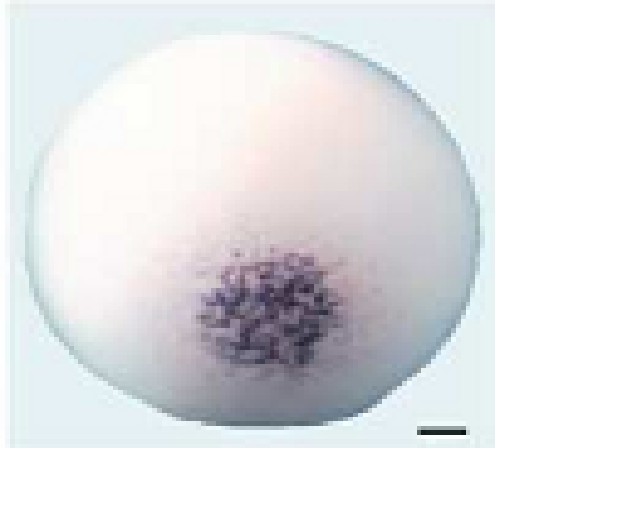 nanos1 ( nanos homolog 1) gene expression in Xenopus laevis embryo, assayed via in situ hybridization, NF oocyte stage iV, vegetal view.