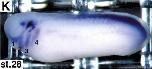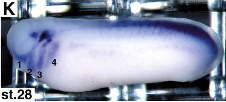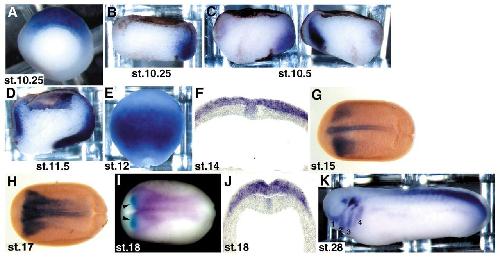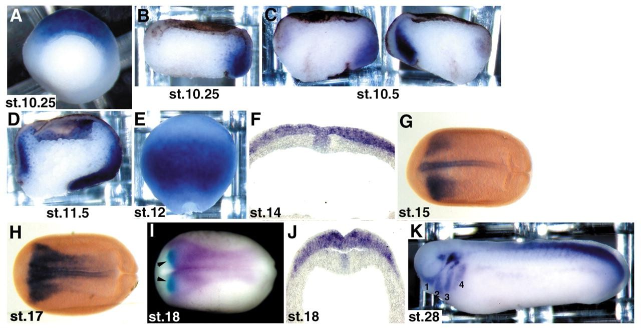 Fig. 3. Localization of Xror2 transcripts visualized by whole-mount in situ hybridization. (A) Vegetal view of the gastrula (dorsal is upwards). (B) Hemisectioned early gastrula (animal is upwards; dorsal towards the right). Embryos were bisected sagittally before whole-mount in situ hybridization. (C) Comparison of expression domains between Xror2 (left panel) and Xlim-1 (right panel) at the gastrula stage. Embryos were bisected into left and right halves and subjected to in situ hybridization for Xlim-1 and Xror2, respectively. Dorsal is towards the right (Xror2) or the left (Xlim-1). (D) Late gastrula bisected sagittally (animal is upwards; dorsal towards the right). (E) Dorsal view of late gastrula (anterior is upwards). (F) Transverse section of stained embryos. Xror2 transcripts are detected in the notochord and neuroectoderm. (G,H) Dorsal view of mid-neurula embryos cleared with benzyl benzoate/benzyl alcohol. Xror2 transcripts were detected in the notochord and neuroectoderm with a clear anterior limit in the neuroectoderm. (I) Double whole-mount in situ analysis of Xror2 (magenta) and en2 (turquoise). Arrowheads, en2 expression. (J) Transverse section of neurula embryos. (K) Lateral view of tailbud-stage embryos. Numbers 1, 2, 3 and 4 indicate Xror2 expression in mandibular crest, hyoid crest, anterior branchial crest and posterior branchial crest segments, respectively. st., developmental stages. |