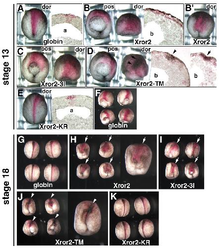 Fig. 5. Analysis of convergent extension and neural plate closure after overexpression of Xror2 constructs. mRNA (1 ng/embryo) of globin (A,G), Xror2 (B,Bâ²,H), Xror2-3I (C,I), Xror2-TM (D,J) or Xror2-KR (E,K) as indicated was injected together with nβ-gal mRNA (20 pg/embryo) for a tracer into one blastomere on the dorsoanimal and right side at the four-cell stage, and subjected to β-gal staining (red). (A-F) Stage 13 embryos; dor, dorsal view; pos, posterior view; a, archenteron; b, blastocoel. (G-K) Stage 18 embryos (dorsal view; anterior is upwards). (A) Globin-expressing control embryos and a section. As a result of normal convergent extension, nβ-galpositive cells were restrictedly distributed along the midline in the trunk region (see also G). (B,Bâ²) Xror2-expressing embryos (and section in B) with and without open yolk plug, respectively. nβ-gal-stained cells were laterally expanded on the right side of both mesoderm and ectoderm layers as a result of the inhibition of convergent extension. (C) Xror2-3I-expressing embryos showing weaker phenotypes than did wild type. (D) Xror2-TM-expressing embryos. nβ-gal-stained cells were laterally expanded, and condensation of pigmented cells was observed in nβ-gal-positive regions of ectoderm, as indicated by the arrow and arrowhead, each of which show the corresponding position in a whole embryo (second panel from the left) and in sections (third or fourth panel). When nβ-gal-positive cells were laterally expanded, the archenteron was not formed (B,D). (E) Xror2-KR-expressing embryo and section showing normal-looking cell movements. (F) Globin-expressing embryos with open yolk plug. In a few embryos that had open yolk plugs as a result of overexpressing globin, nβ-gal-positive cells still converged to the midline. (G) Globin-expressing embryos at stage 18. nβ-gal-positive cells were restrictedly distributed along the midline in the trunk region. (H) Xror2-expressing embryos which failed to close the neural plate in nβ-gal-positive regions (white arrows). Right panel, higher magnification. (I) Xror2-3I-expressing embryos showing weaker phenotypes than those of wild-type Xror2-expressing embryos. (J) Xror2-TM-expressing embryos. Expression of Xror2-TM resulted in neural groove-like formation with pigmented cells (white arrowheads). Right panel shows a higher magnification. (K) Xror2-KR-expressing embryos. Xror2-KR does not have apparent phenotypes, similar to globin control. |