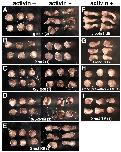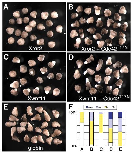 Fig. 8. Effects of Xror2 on activin-induced elongation of animal caps can be cancelled by Cdc42T17N, a dominant-negative Cdc42 mutant. mRNA injection and animal cap assay were performed as described in Fig. 7. All animal caps were treated with activin A. (A) Xror2 inhibits elongation of animal caps by activin. (B) Co-expression of Cdc42T17N with Xror2 partially rescues the extent of explant elongation. (C) Xwnt11 inhibits elongation of animal caps. (D) Co-expression of Cdc42T17N with Xwnt11 partially rescues explant elongation. (E) Globin-expressing animal caps (negative control) treated with activin show elongation. Amounts of mRNA (ng/embryo):Xwnt11, 0.5; Cdc42T17N, 0.6; Xror2, 0.2; globin, 1. (F) Summary of activin-induced elongation assay. The extent of animal cap elongation induced by activin (A-E) was classified by blind scoring as follows. -, no elongation; +, weak elongation; ++ moderate elongation; +++, strong elongation. |