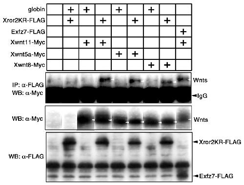Fig. 9. Xror2 can associate with Xwnt11, Xwnt5a and Xwnt8. Proteins were extracted from embryos injected with mRNA as indicated, immunoprecipitated (IP) with anti-FLAG antibody, and subjected to western blotting (WB) using anti-Myc antibody (top). The equivalent amounts of proteins generated from injected mRNAs were confirmed by western blotting of lysates using anti-Myc (middle) or anti-FLAG (bottom) antibody. White arrowheads, Wnt proteins. Amounts of mRNA (ng/embryo): globin, 1 (with Xror2KR-FLAG) or 2; Xror2KR-FLAG, 2; Exfz7-FLAG, 0.5; Xwnt11-Myc, 0.5 (with Exfz7-FLAG) or 1; Xwnt5a-Myc, 1; Xwnt8-Myc, 1. |