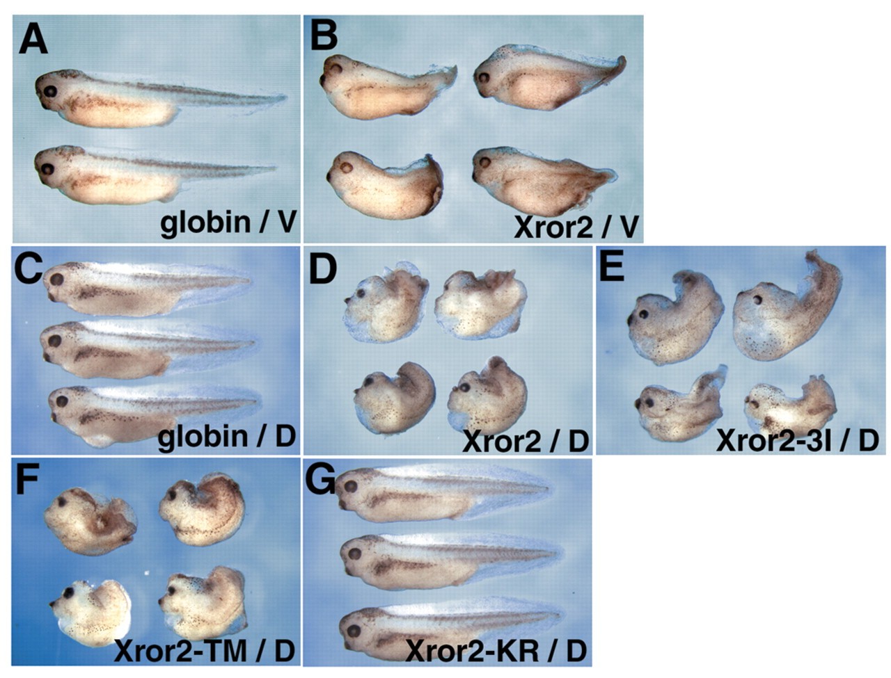 Fig. 4. Overexpression of Xror2 and its mutant constructs causes a shortened anteroposterior axis. Two blastomeres of four-cell stage embryos were injected in the ventral (/V) or dorsal (/D) equatorial region with mRNAs (1 ng/embryo) as indicated (A-G). Injected embryos were cultured until stage 38. (A,C) Globin mRNA-injected control embryos. (B) Ventral overexpression of Xror2 causes malformation in posterior structures. (D-F) Dorsal overexpression of Xror2 and kinase domain mutants (Xror2-3I, Xror2-TM) causes a shortened body axis with dorsal bending and abnormalities in head structures, including one-eyed phenotypes. (G) Xror2-KR shows much weaker phenotypes than the other constructs of Xror2. |
