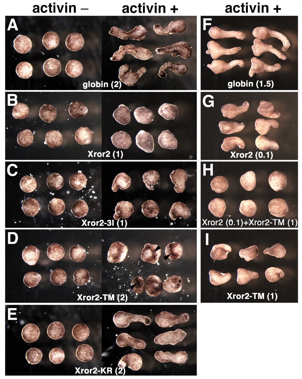 Fig. 7. Effects of Xror2 and its mutant constructs on morphogenetic movements of animal caps stimulated with activin. Two-cell stage embryos were injected with mRNAs of globin (A,F), Xror2 (B,G), Xror2-3I (C), Xror2-TM (D,I), Xror2-KR (E) or a mixture of Xror2 and Xror2-TM (H) in the animal pole region of both blastomeres. Doses of injected mRNA (ng/embryo) are indicated in parentheses. Note that doses of mRNA used in F-I are lower than in A-E. Animal caps (stages 8-8.5) were treated with (right panels in A-E; F-I) or without (left panels in A-E) activin A as indicated and cultured until sibling stage 18. A-E and F-I are separate experiments. Activin treatment initiated elongation of control animal caps (A,F). Xror2 (B), Xror2-3I (C) and Xror2-TM (D) suppressed elongation of animal caps by activin. In Xror2-TM-expressing animal caps, a neural groove-like structure with pigmented cells (black arrowheads) was observed in activin-treated ones. Elongation of Xror2-KR-expressing animal caps treated with activin was slightly reduced (E), compared with globin-expressing animal caps. Xror2 or Xror2-TM with lower doses show moderate inhibition of activin-induced elongation of animal caps (G,I). Co-expression of Xror2 and Xror2-TM shows cumulative effects on the inhibition of activin-induced elongation, indicating that wild-type and Xror2-TM do not compete with each other (H). |