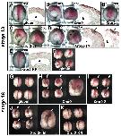 Fig. 6. Wild-type and its intracellular mutants of Xror2 affect convergent extension of neural tissue and notochord but not cell differentiation markers. Embryos were injected with mRNA as indicated, and were subjected at stage 18 to β-gal staining (red) and whole-mount in situ hybridization with pan-neural marker nrp1 (A-C) or notochord marker XPA26 (D-F) as probes. Right panel, sections of stained embryos; inset, higher magnification of neural tissue or notochord region. Expression domains of nrp1 were widened laterally and shortened anteriorly in Xror2- (B) and Xror2-TM- (C) expressing embryos, compared with globin-expressing embryos (A). nrp1 expression was not inhibited in nβ-gal-positive regions of Xror2- (B) and Xror2-TM- (C) expressing embryos (right panel, inset). Expression domains of XPA26 failed to elongate anteriorly and were located near the blastopore in Xror2- (E) and Xror2-TM- (F) expressing embryos, compared with those expressing globin (D) (left panel). Areas of XPA26 expression domains on section are much larger in Xror2- (E) and Xror2-TM- (F) expressing embryos than in globin-expressing embryos (D) (right panel, inset), whereas there is no inhibition of XPA26 expression in nβ-gal-positive regions. a, archenteron; arrowhead, collapsed archenteron; arrow, thickened pigmented epithelial layers of the ectoderm. |