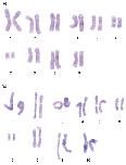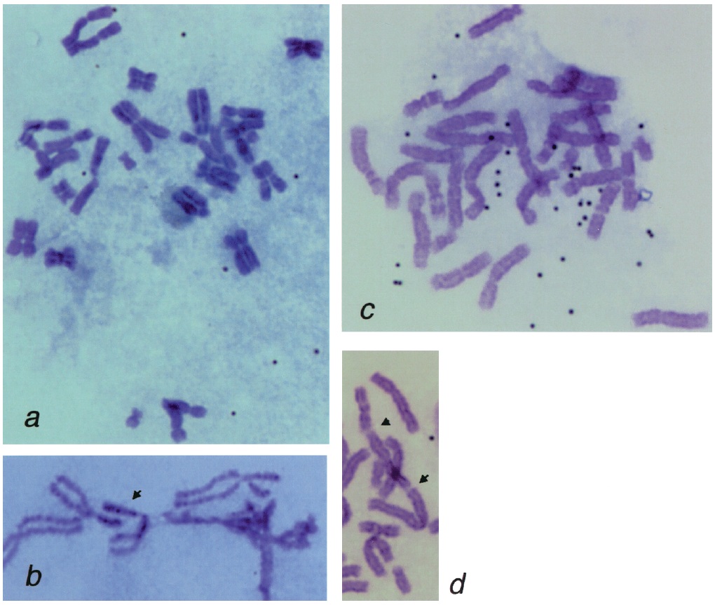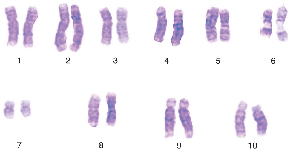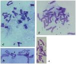 Developmental cytogenetic analyses of Xenopus tropicalis larvae from two origins were performed on stage 27-34 heads treated with colchicine. Standard G-band karyotyping using trypsin and chromosome mapping of 184 bands were examined. Although the main karyotype was 2n = 20, polyploidy (3n = 30 or 4n = 40) and aneuploidy were detected in each individual treated with colchicine, even those treated for only 1 h. The percentage of polyploid karyotypes was 10-20% across the total of measured metaphases. The mean mitotic index was 0.10. Chromosomal breaks and exchanges were detected at the secondary constriction of chromosomes 5 or 6. Ag-band detection showed clearly positive staining at the secondary constriction of chromosome 5, which corresponds to the nucleolar organizer region. Tandem duplication of negative G-bands at the secondary constriction of chromosome 6 and the short arm of chromosome 10 was suggested by this study. X. tropicalis thus provides a good model to study the mechanism and effects of chromosomal abnormalities, gene mapping and tissue specific gene expression in the developmental process.