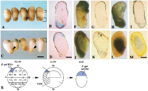 blastomeres (A4, B4, C4 or D4) of the 32-cell stage embryo were injected with -galactosidase RNA. The VMZ region was excised at