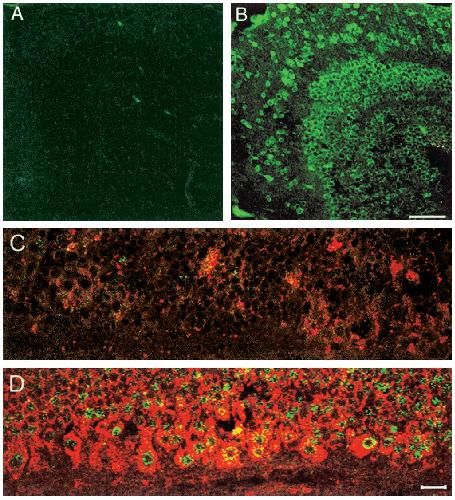 Fig. 8. Xenopus basic transcription element binding protein (xBTEB) in the tadpolebrain is developmentally and hormonally regulated and is not expressed in proliferating cells. Double labeling immunohistochemistry was used to analyze xBTEB protein and bromodeoxyuridine (BrdU)-labeled cells.