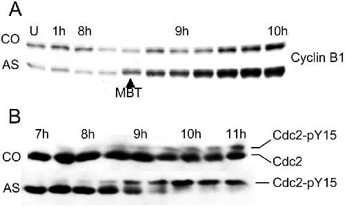 Fig. 4. Cdc2 is hyperphosphorylated on tyrosine-15 in the absence of geminin. (A) Cyclin B1 accumulates in geminin-depleted embryos. Two-cell embryos were injected with antigeminin (AS) or control (CO) oligonucleotide and cultured in vitro. At various times after fertilization, the concentration of cyclin B1 was determined by immunoblotting. U, unfertilized egg. (B) Cdc2 becomes hyperphosphorylated geminin-depleted embryos. Same protocol as in A but a different experiment. The extent of Cdc2 phosphorylation was determined by immunoblotting with a mouse monoclonal Cdc2 antibody. The Y15-phosphorylated form of Cdc2 migrates through a polyacrylamide gel more slowly than the unphosphorylated form (Hartleyet al., 1996).