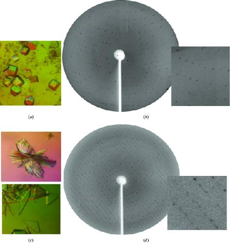 Figure 2. (a) Trigonal crystals in 40% (NH4)2SO4, 0.2 M sodium citrate pH 6, 17 mg ml−1 protein, 50 mM UMP at 293 K and (b) their diffraction image with an enlargement. (c) Monoclinic crystals in 40% NH4SO4, 0.2 M sodium phosphate pH 5.5, 17 mg ml−1 protein, 50 mM UMP at 293 K improved by seeding from aggregated (top) to single crystals (bottom) and (d) their diffraction image with an enlargement.