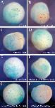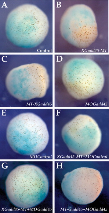 Fig. 3. XGadd45-γ overexpression antagonizes cell division. Animal views of stage 11 embryos injected with 0.5 ng of the indicated mRNAs and/or 10 ng of the indicated morpholino oligonucleotide and 0.3 ng of lacZ mRNA. Embryos were in situ hybridized for lacZ mRNA (blue) and stained for anti PH3 as a mitotic marker. (A) Distribution of mitotic cells in stage 11 control embryos injected with lacZ mRNA alone. (B,C) Expression of XGadd45-MT (B) or MT-XGadd45 (C) reduces the number of dividing cells. (D,E) Injection of MOGadd45 (D) or a control morpholino oligonucleotide (E) did not affect the number of dividing cells. (F,G) Reduction of mitotic cells promoted by XGadd45-MT mRNA is not affected by coinjection of a control morpholino (F) but is antagonized by coinjection of MOGadd45 (G). (H) MOGadd45 cannot interfere with MT-XGadd45 promoted cell cycle arrest. |