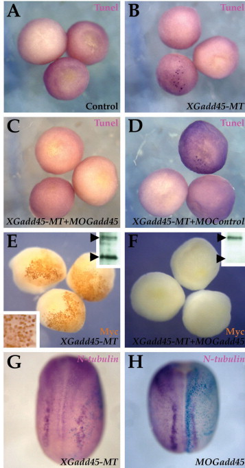 Fig. 4. XGadd45-γ overexpression causes a mild increase of cell death. Animal views of stage 11 (AâF) and dorsal views of stage 15 (G,H) embryos injected with 0.5 ng of the indicated mRNAs and/or 10 ng of the indicated morpholino oligonucleotide. (AâD) Tunel staining to label apoptotic cells. (A) Uninjected embryos showed no apoptotic cells. (B) In a few embryos injected with XGadd45-MT mRNA several dying cells were detected. (C,D) This effect was antagonized by coinjection of MOGadd45 (C), but not by a control morpholino (D). (E) The Myc epitope was detected in XGadd45-MT injected embryos. The XGadd45-MT protein was present both in the nucleous and in the cytoplasm (lower inset). Upper inset shows a western blot to detect Myc in XGadd45-MT injected embryos. Note the presence of both a control cross-reacting protein (upper band) and the XGadd45-MT protein (lower band). (F) In embryos coinjected with XGadd45-MT mRNA and MOGadd45 the Myc epitope was undetectable both in whole mount and in western blot (inset). However, the control cross-reacting protein (upper band, inset) is present.(G,H) N-tubulin expression is not affected in embryos injected with XGadd45-MT mRNA (G) or MOGadd45 (H). |